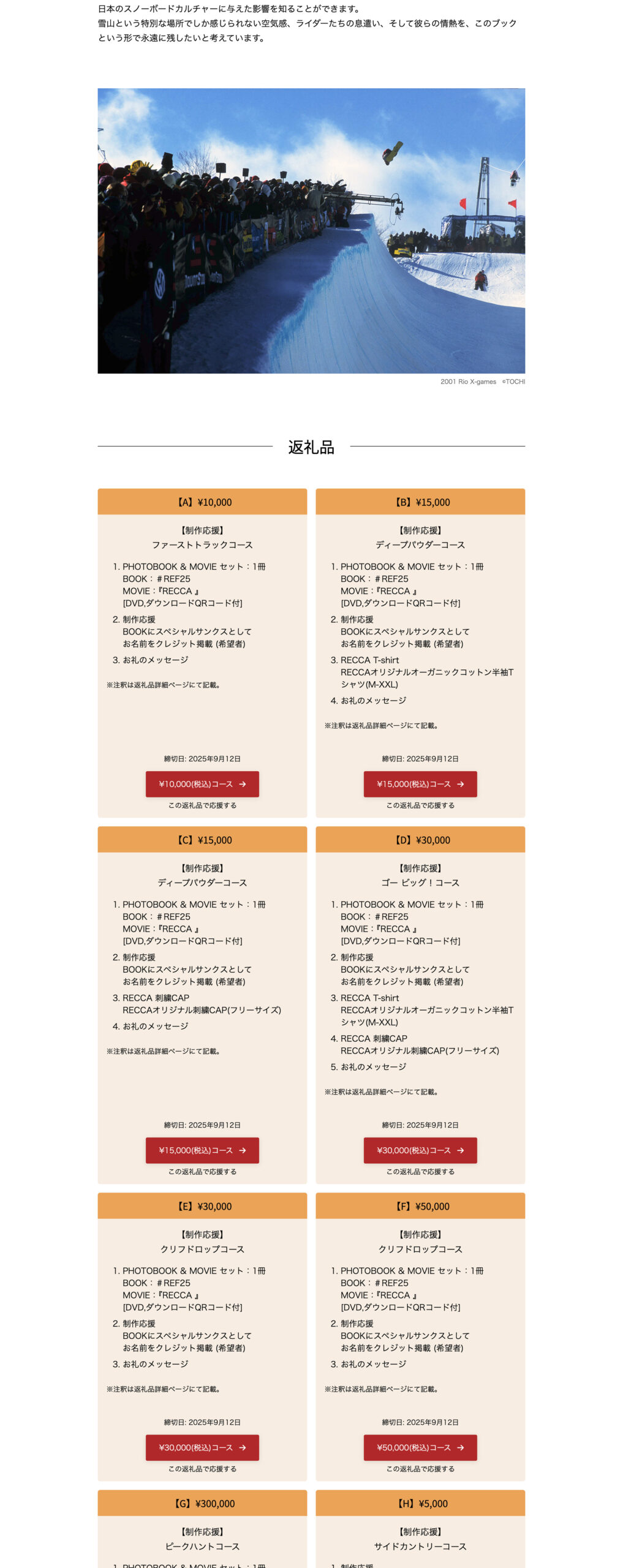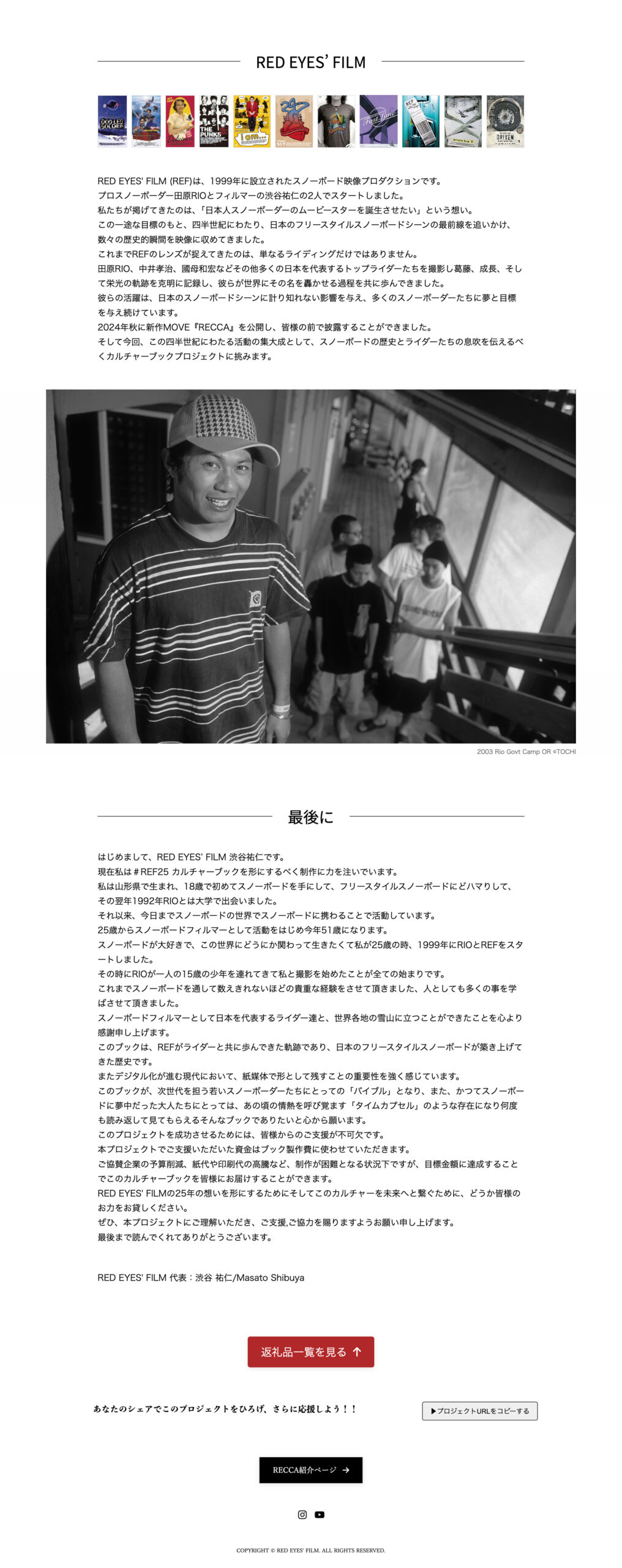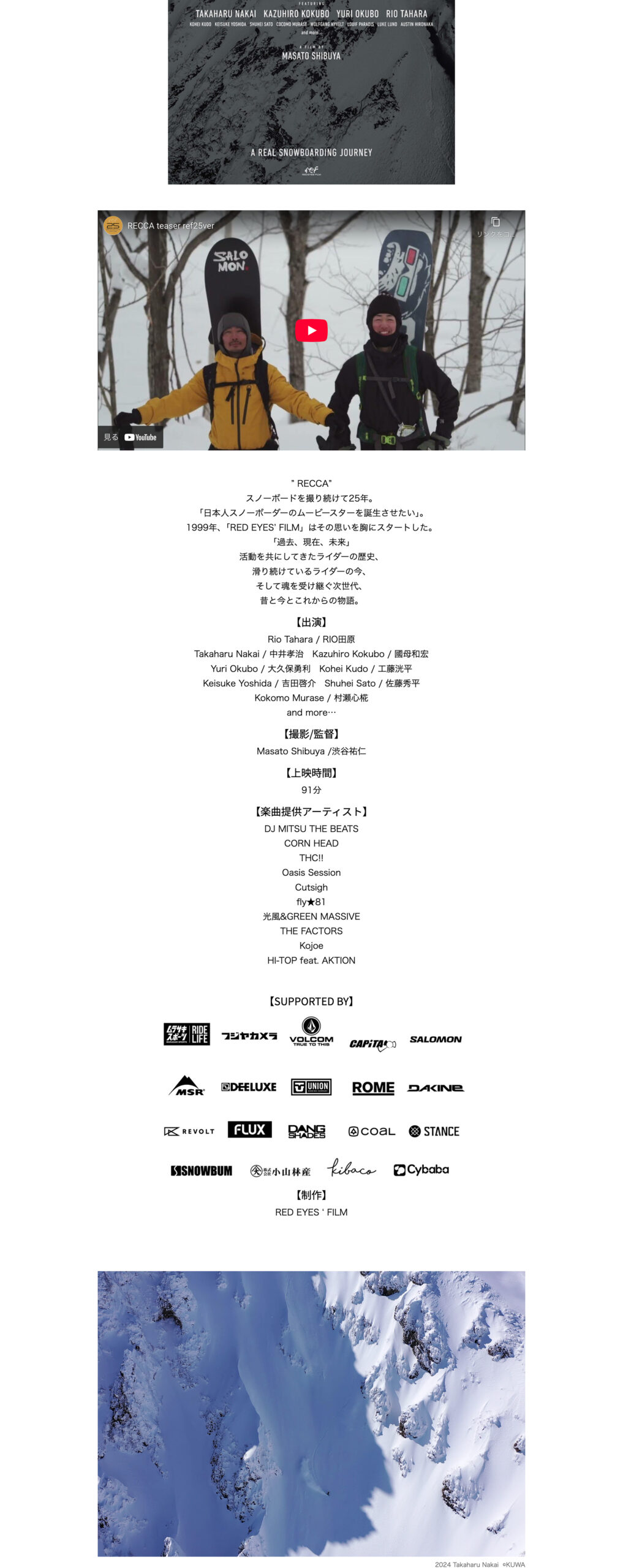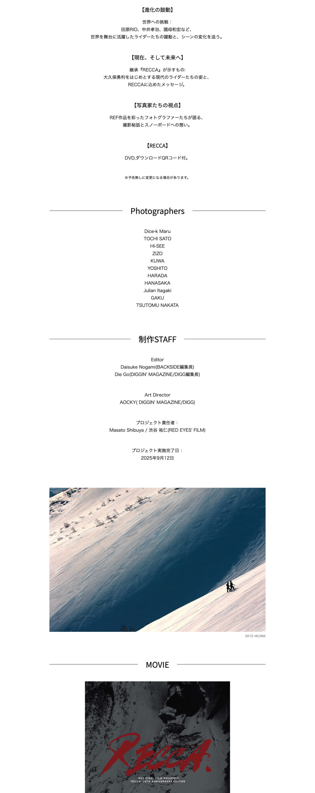 四半世紀にわたる活動の集大成として、スノーボードの歴史とライダーたちの息吹を伝えるべく、カルチャーブックプロジェクトに挑んでいます。2024年秋に公開した新作MOVE『RECCA』とブックがセットになったカルチャーブックの制作プロジェクトサイト。